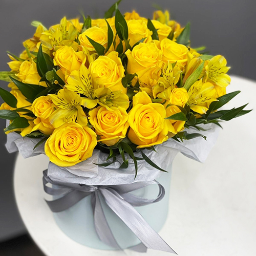 Композиция в шляпной коробке "Розиль" из альстромерий и роз