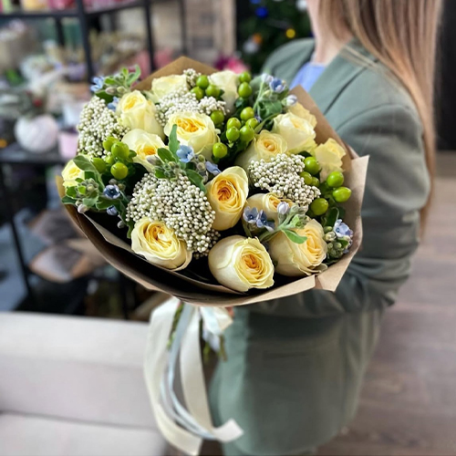 Букет "Мичиган" из пионовидных роз Баттеркап, озатамнуса, оксипеталума и гиперикума